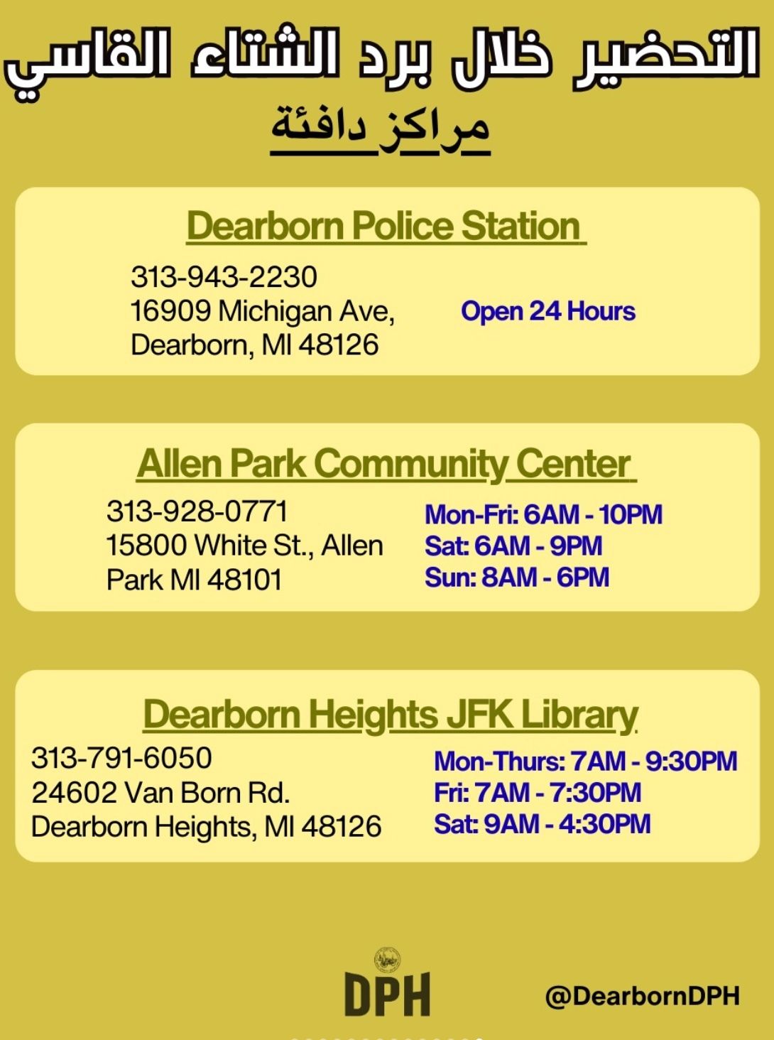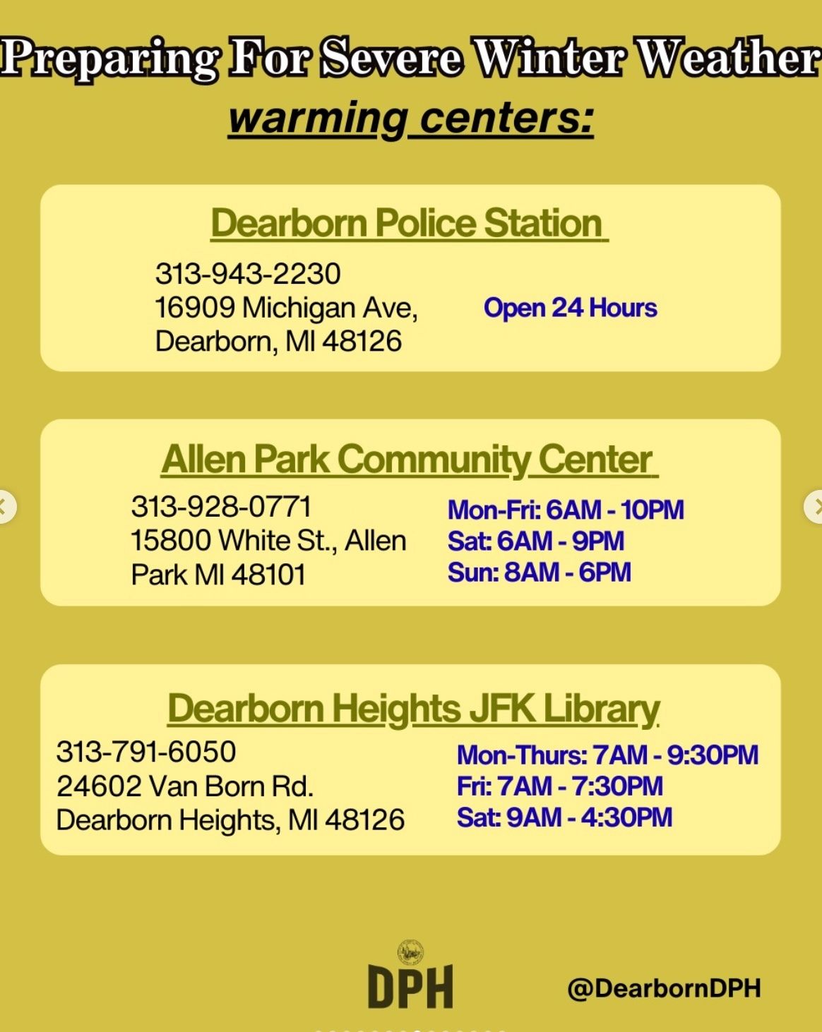 Resources for Severe Winter Weather ❄️ The locations listed above are warming centers in the Dearborn area where you can stay safe and warm during severe winter weather. These centers provide shelter from extreme cold and help reduce risks like hypothermia, frostbite, and other cold-related health issues.